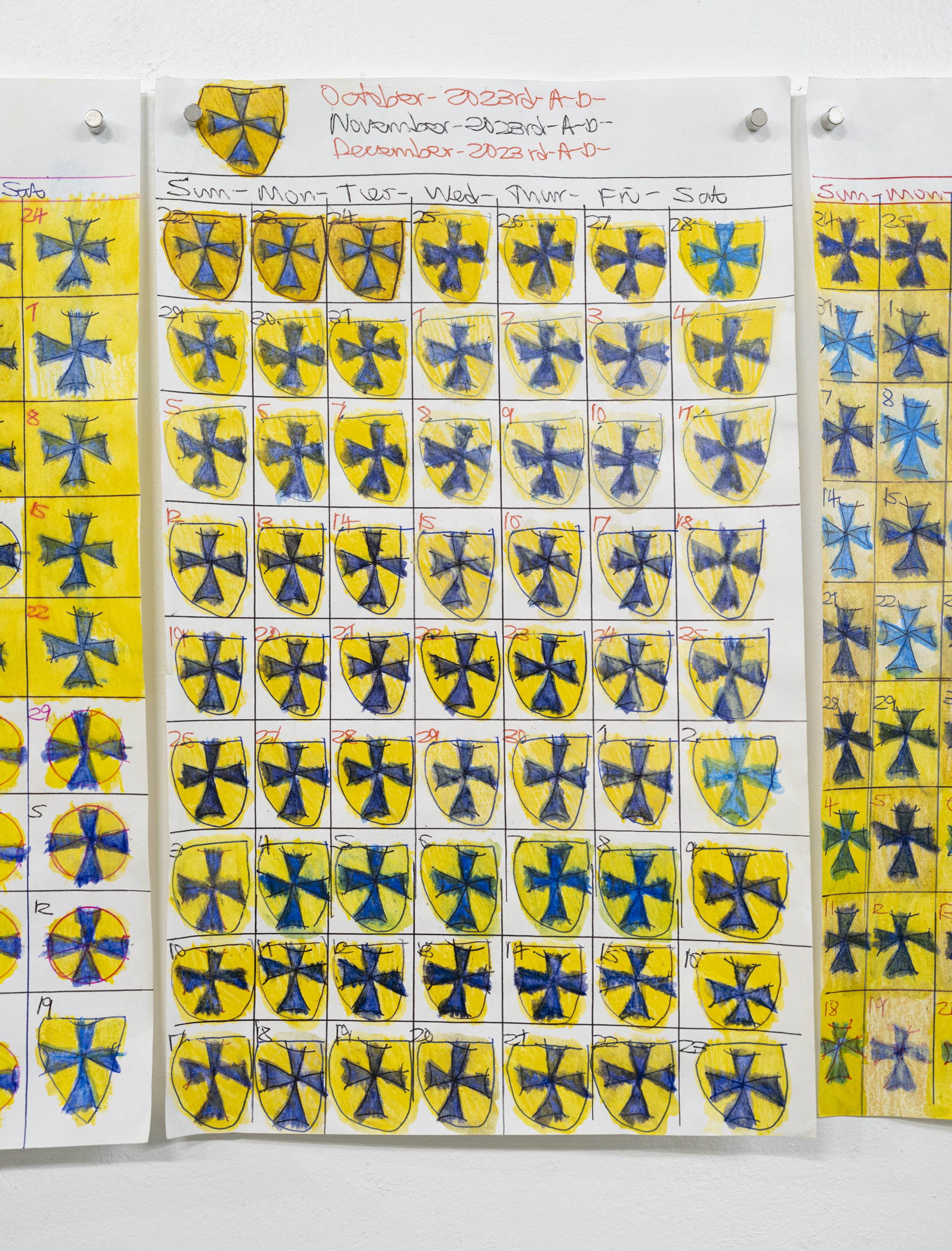 Dan draws deep inspiration from both world history and current events. Many of the colored symbols on his calendars, he explains, represent shields and crosses tied to events from the history of the Crusades. Others reflect the colors of national flags involved in present-day conflicts, such as the Ukrainian-Russian war and the Israeli-Palestinian conflict. Some symbols are known only to Dan himself. Interwoven with these symbols are Dan’s handwritten reminders of holidays, personal milestones, and significant dates in American history.